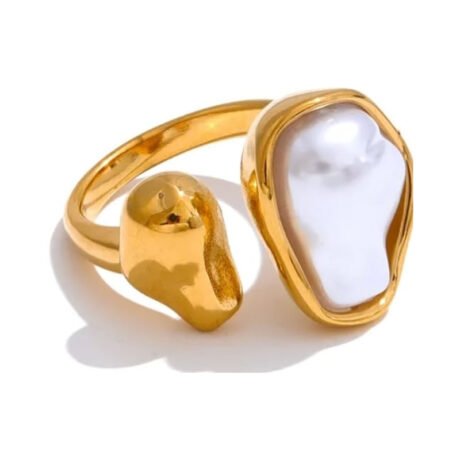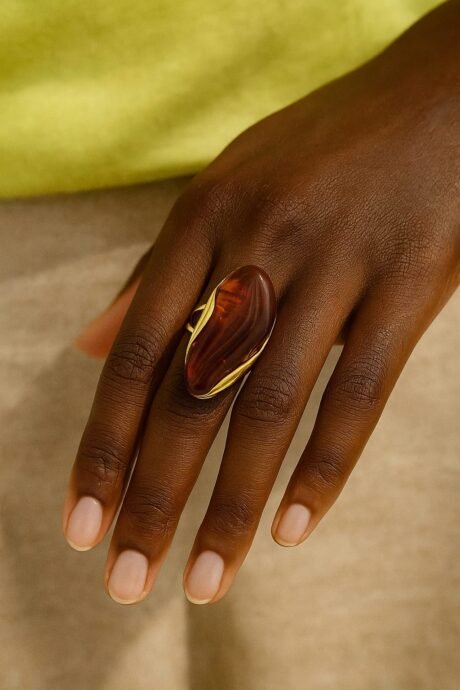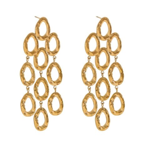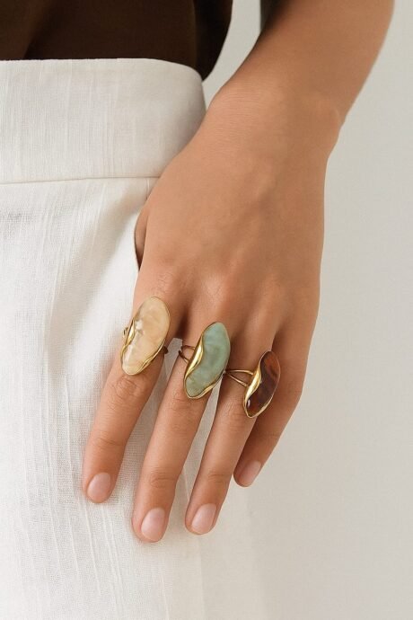 Adjustable gold earring with oval gemstones in pink and tiger eye colors.