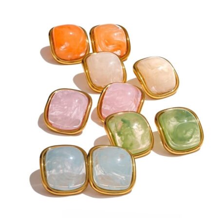 Gold teardrop earrings with colorful resin stones.