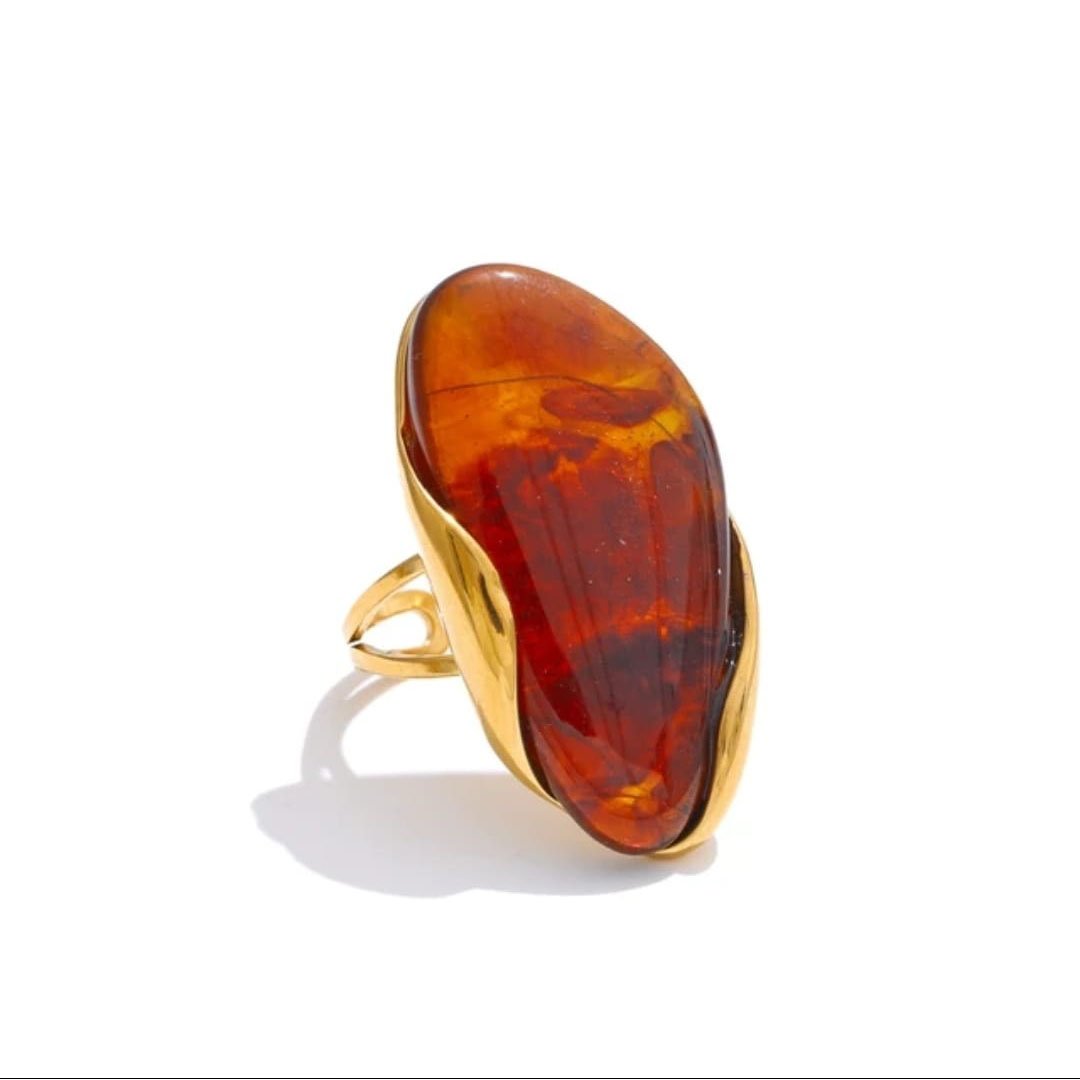 Bold gold earring with amber-like stone, perfect for a sophisticated look.