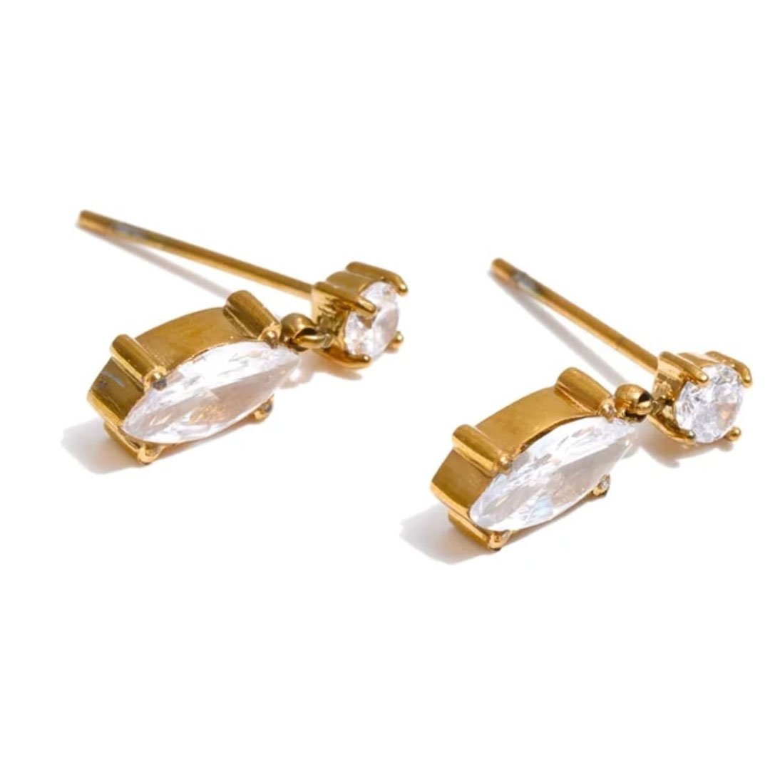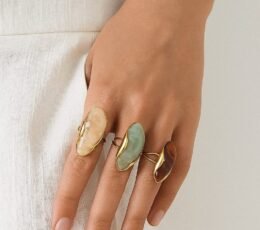 Adjustable gold earring with oval gemstones in pink and tiger eye colors.