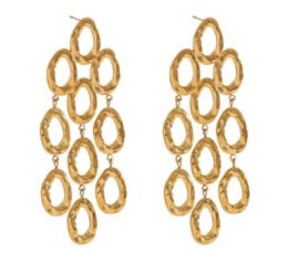 Adjustable gold earrings with turquoise, green, and red cabochon stones.