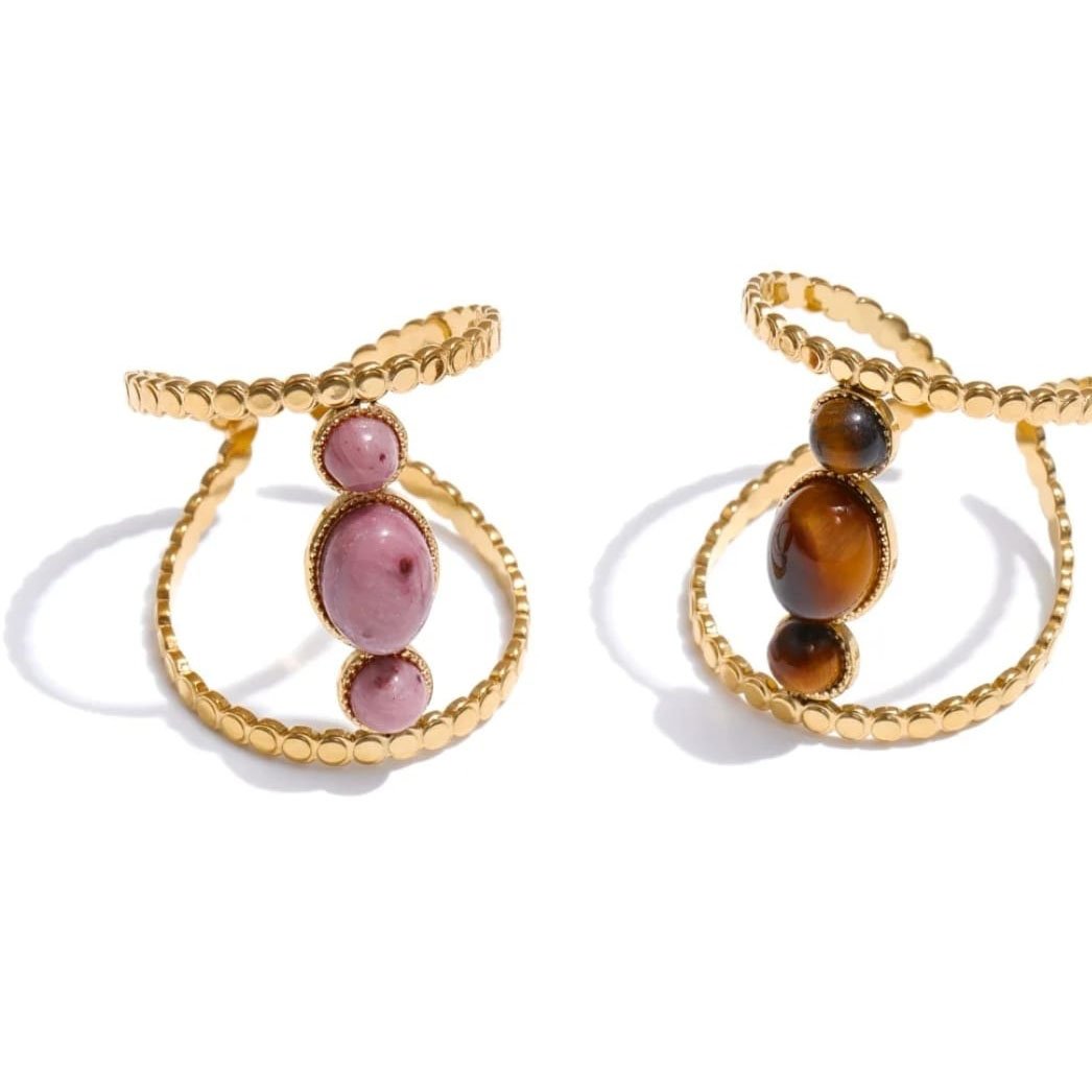 Large statement rings with natural stones in beige, green, and amber colors.