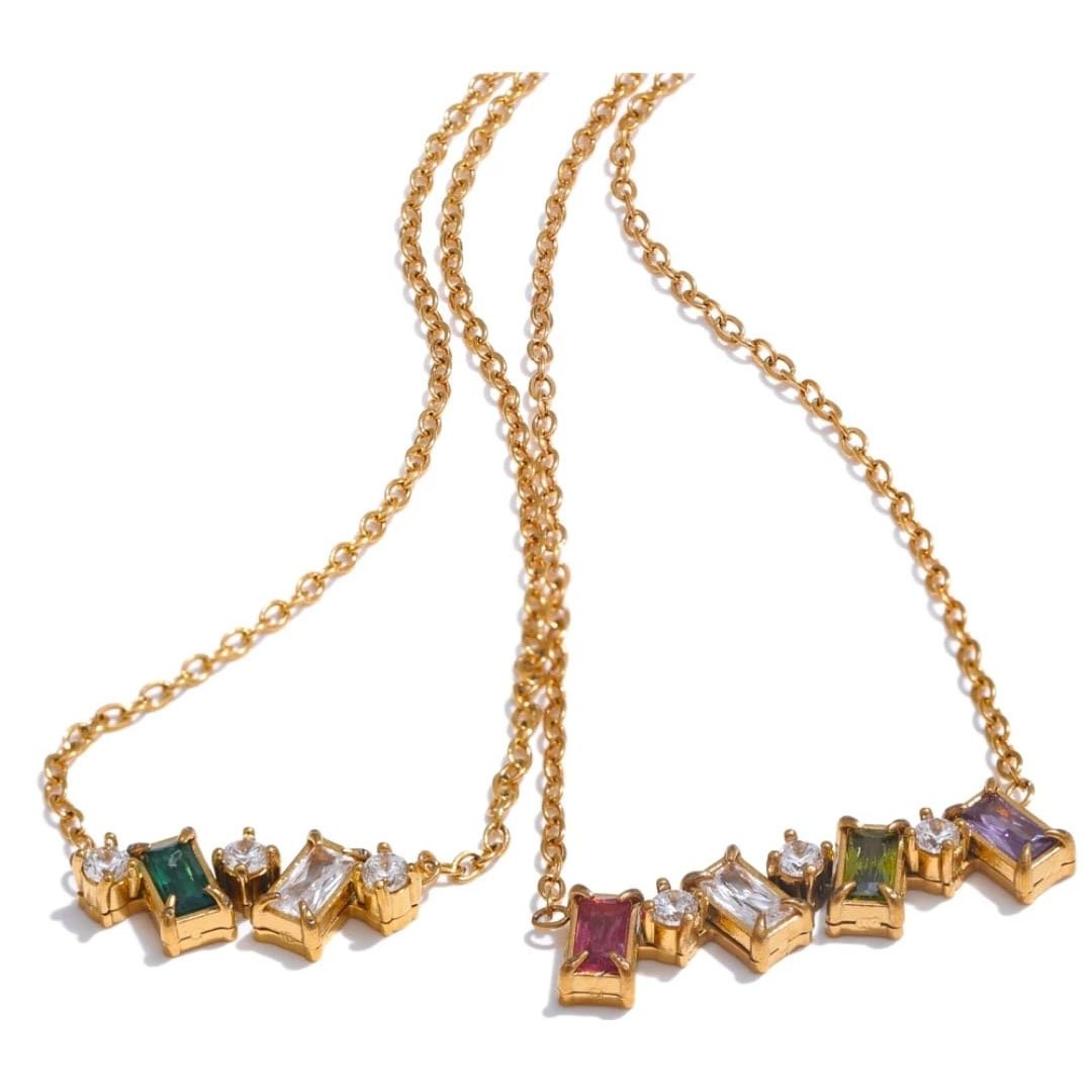 Elegant gold pendant necklace with squareand round zircon stones.