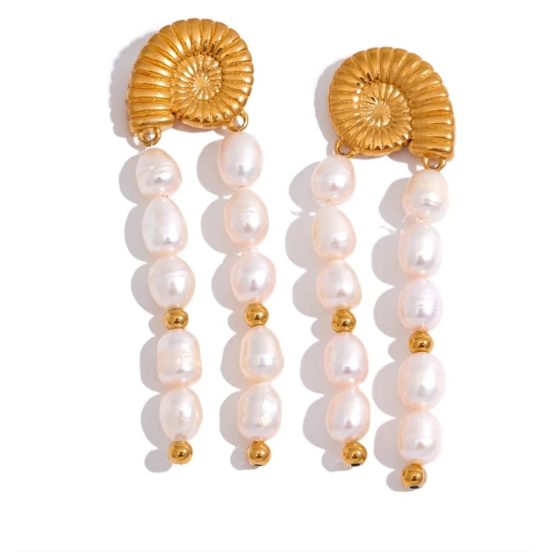 Trendy gold earrings with long chains and pear-shaped zircon drops.